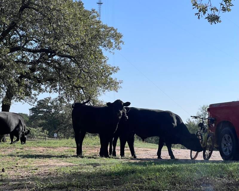 In the morning, our "intruder" came by, offered a greeting, and promptly drove away to set up his portable deer stand. Again, he left us to enjoy the morning campfire alone...at least until the herd of cows strolled in. I had to laugh.