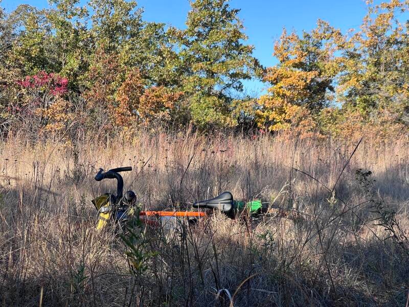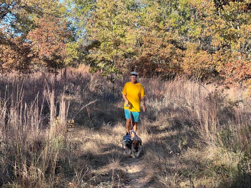 For example, we'll load up bike and dogs and head to the grasslands. We'll start down a trail together, and while she walks at a steady pace, I'll go forward, come back, go forward, walk into the woods to scout a future camp spot, come back, then go to the next fork in the trail and make sure we go the same direction.